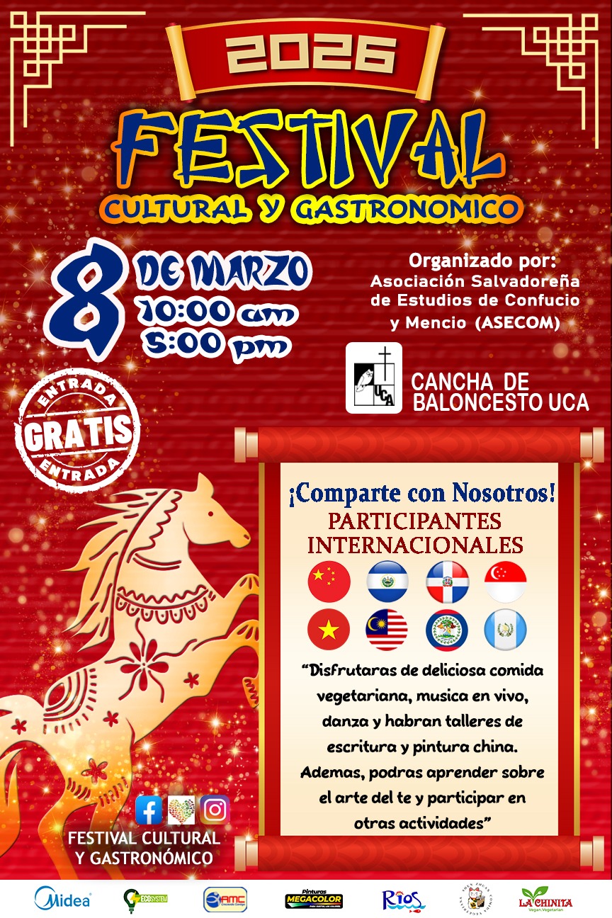 La Asociacion Salvadoreña de Estudios de Confucio y Mencio (Asecom) celebrará el Año Nuevo Chino el próximo 8 de marzo en El Salvador, con el “Festival Cultural y Gastronómico 2026” a realizarse en las canchas de baloncesto de la Universidad Centroamericana José Simeón Cañas (UCA).