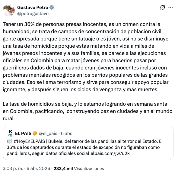 Petro aseguró en X que “tener un 36 % de personas presas inocentes es un crimen contra la humanidad, se trata de campos de concentración de población civil, gente apresada porque tiene un tatuaje o es joven”.