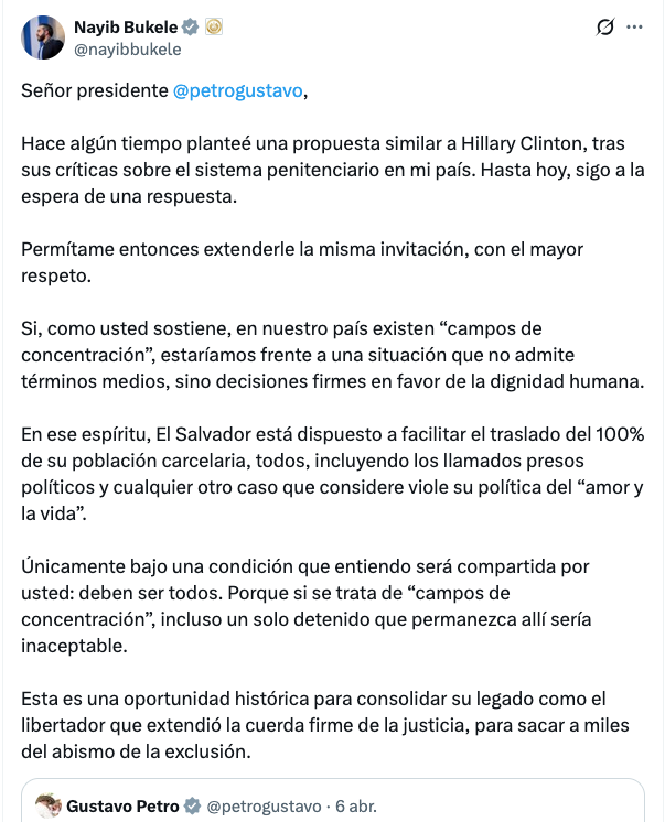 Como respuesta a la afirmación del presidente colombiano Gustavo Petro sobre las cárceles en El Salvador, el presidente salvadoreño, Nayib Bukele, le ofreció trasladarle a todas las personas detenidas.