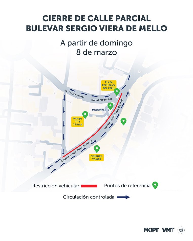 El viceministro de Transporte, Nelson Reyes, explicó que la circulación entre el Paseo General Escalón hacia la plaza Italia, sobre el bulevar Sergio Viera de Mello, no estará permitida, pero en su lugar habilitarán como vía alterna el paso por la avenida Las Magnolias.