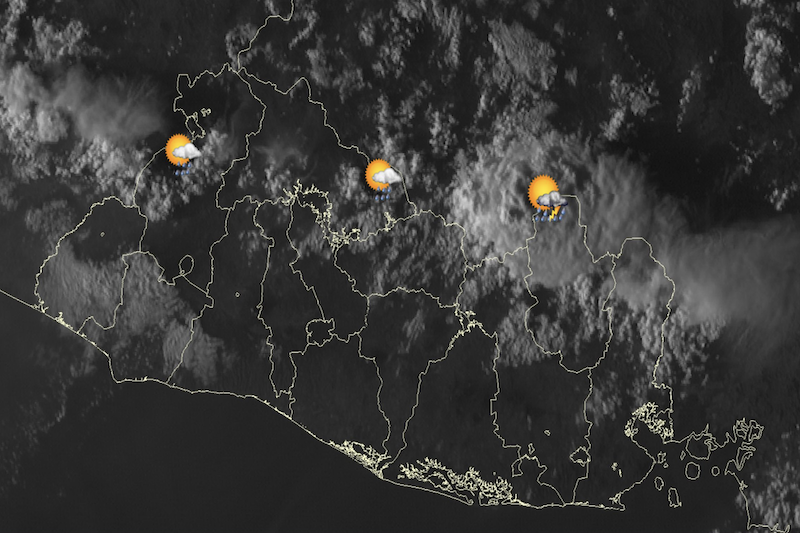Durante la tarde, las condiciones serán más inestables, con cielo mayormente nublado y lluvias acompañadas de tormentas en la cordillera volcánica, la zona paracentral y sectores de la zona central, incluyendo el Área Metropolitana de San Salvador (AMSS) y la zona occidental.