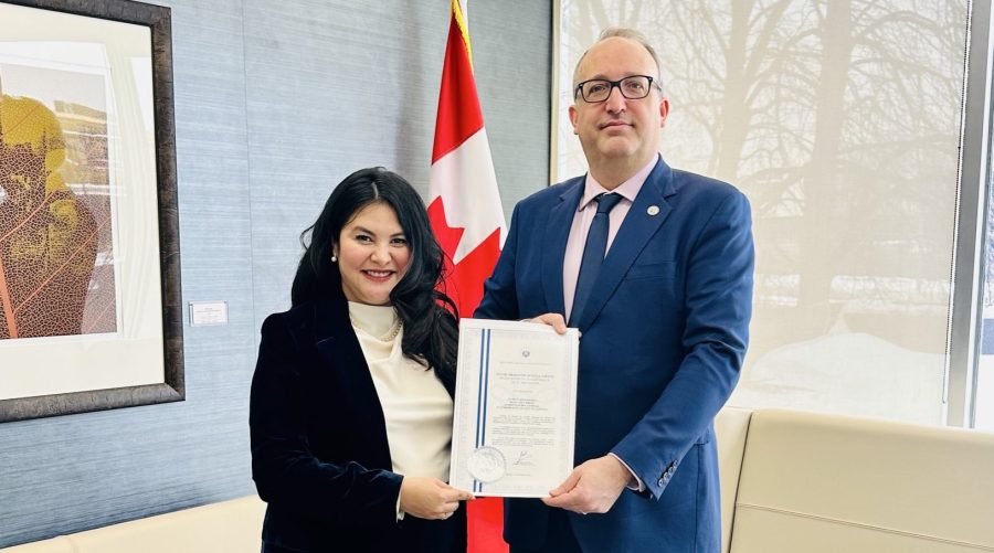Portal anunció la tarde de este miércoles que como embajadora designada de El Salvador en Canadá ya entregó las copias de estilo al director de Protocolo del Ministerio Asuntos Exteriores de Canadá, Sébastien Carrière.