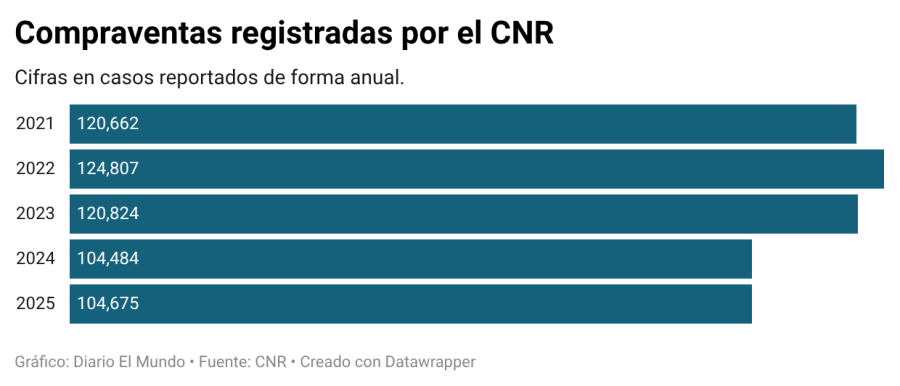 Los datos, divulgados este mes, confirman que las compraventas registradas en el país pasaron de 104,484 en 2024 a 104,675 en 2025, una cifra que representa un aumento de un 0.2 % de las operaciones.