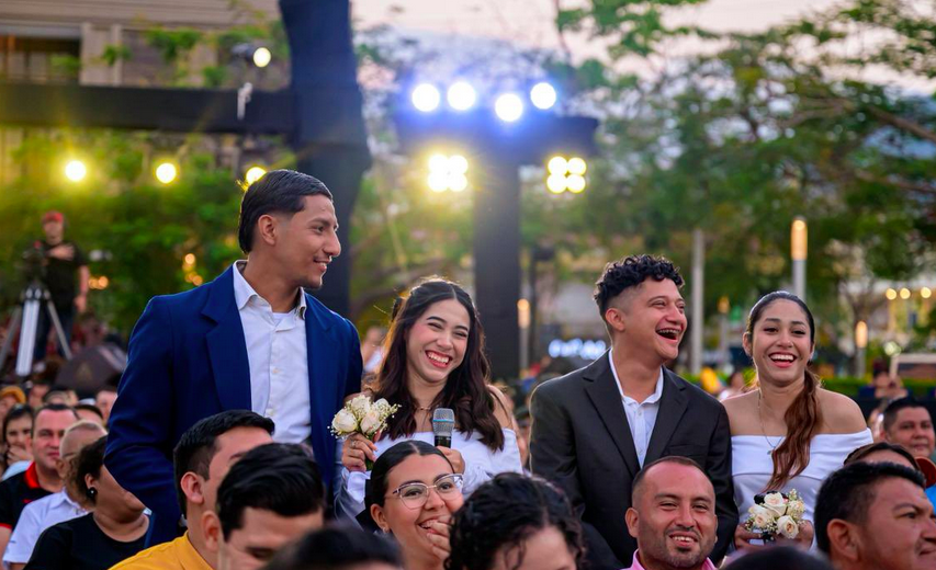 Las parejas fueron captadas por las cámaras frente a un escenario que promovía «la boda colectiva más grande» del país. / Alcaldía de San Salvador.