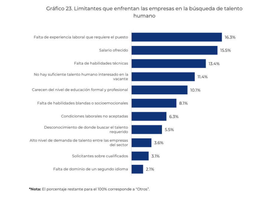Otras dificultades señaladas son la falta de personas interesadas en las vacantes, bajo nivel educativo, ausencia de habilidades blandas y socioemocionales, desconocimiento de requisitos y falta de dominio del inglés.