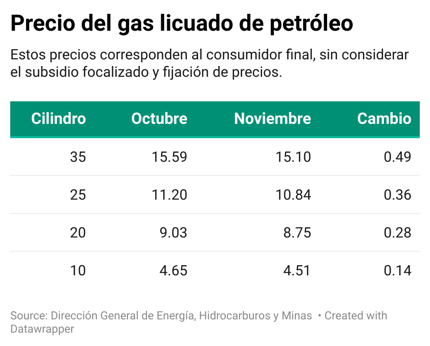 El precio del cilindro de gas licuado de petróleo (GLP) experimentará una reducción de entre $0.14 y $0.49 en noviembre debido a una mayor reserva de este derivado del crudo en el mercado internacional, informó la Dirección General de Energía, Hidrocarburos y Minas (DGEHM).