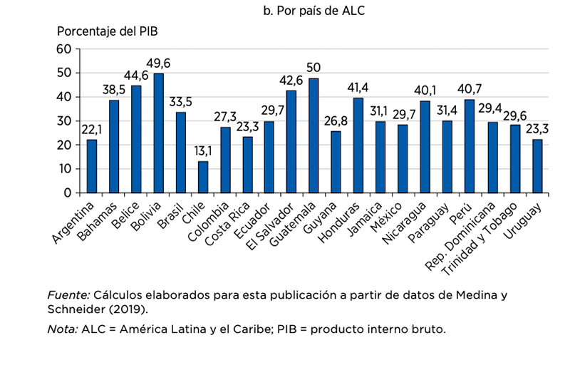 En promedio, América Latina y el Caribe reportan una economía informal equivalente al 33.2 % del PIB, una proporción similar a la de África subsahariana y 3.6 veces superior al 9.1 % registrado en América del Norte.