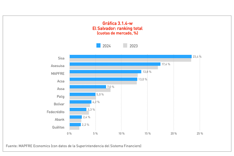 En 2024, la mayor aseguradora del mercado salvadoreño fue SISA, parte del portafolio de Inversiones Cuscatlán Centroamérica —que también controla Banco Cuscatlán—, con una participación del 23.4 %.