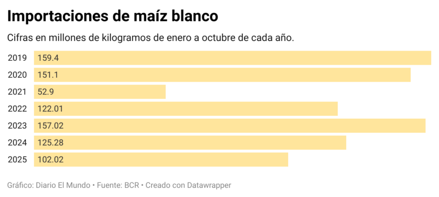 Las estadísticas de la institución confirman que, de enero a octubre de 2025, el país compró 102 millones de kilogramos de maíz blanco, por un precio de $29.2 millones.