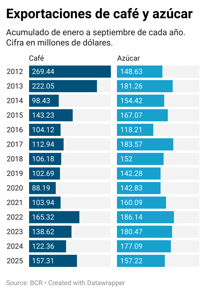 De enero a septiembre de 2025, las exportaciones de café alcanzaron $157.31 millones, ligeramente por encima de los $157.22 millones reportados por el azúcar en el mismo período, algo que no ocurría desde 2012, cuando el llamado “grano de oro” aún mantenía el liderazgo del comercio agrícola.