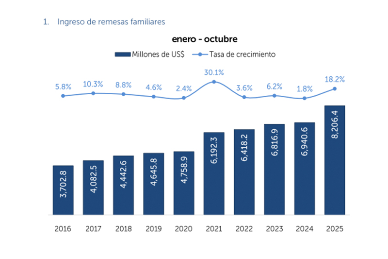 Las remesas familiares alcanzaron un nuevo récord tras superar los $8,206.6 millones en los primeros 10 meses del año, señaló este viernes el Banco Central de Reserva (BCR).