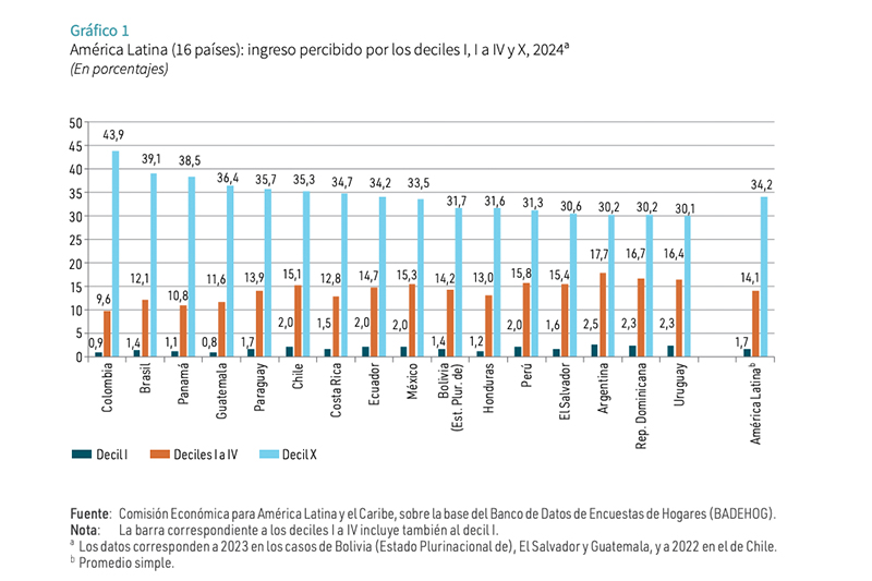 Para El Salvador, la CEPAL aclara que se utilizaron datos correspondientes a 2023, en los que se encontró que el 10 % de la población con mayores ingresos recibe cerca de una tercera parte del total, frente al 10 % más pobre, que capta un 1.6 %. En tanto, los sectores de ingresos medios concentran un 15.4 %.