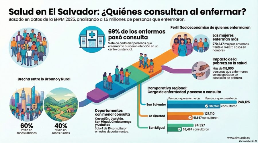 La Encuesta de Hogares de Propósitos Múltiples (EHPM) del Banco Central de Reserva (BCR) de 2025 indicó que el 69 % de la población que se enfermó ese año, decidió pasar consulta en un centro médico asistencial.