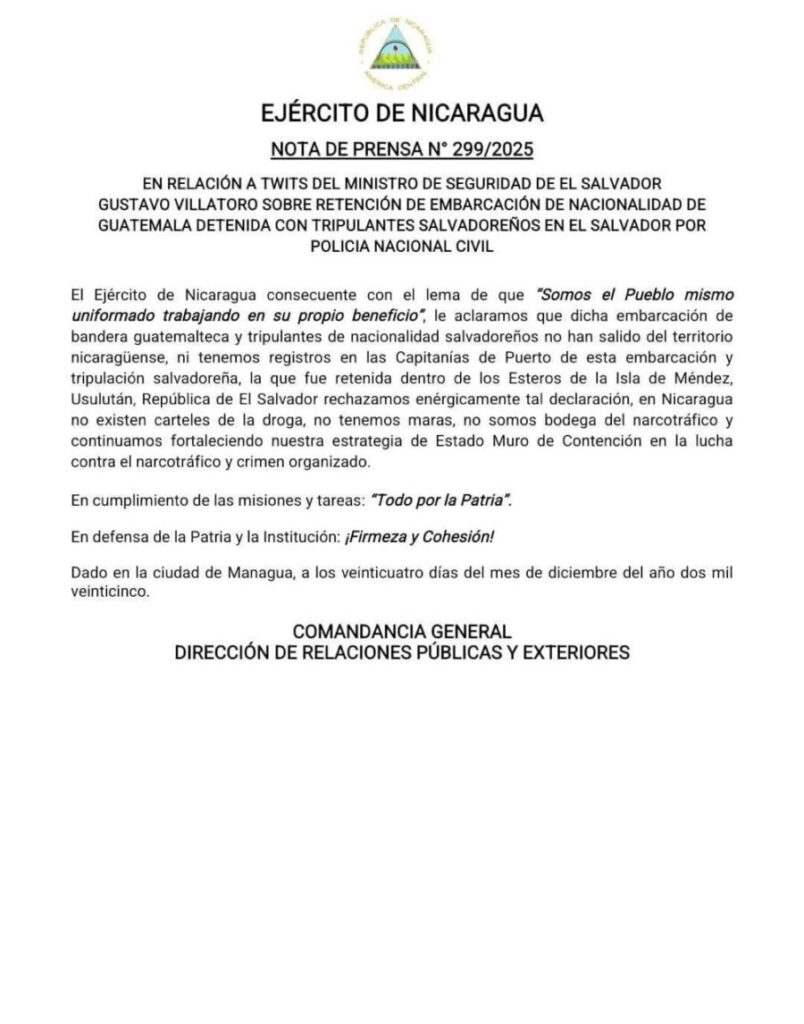A través de un comunicado, emitido este 24 de diciembre, el Ejército del régimen de Daniel Ortega señaló que no tienen registros en las capitanías del puerto de la embarcación referida ni de la tripulación detenida.