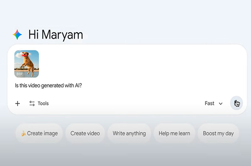 Ante un vídeo de cuestionable origen, los usuarios pueden usar la aplicación móvil de Gemini para pregutnar si está hecho con IA para que busque si cuenta con SynthID, una herramienta de Google que introduce una marca de agua directamente en los píxeles de cada cuadro de vídeo cuando en la creación interviene la IA.