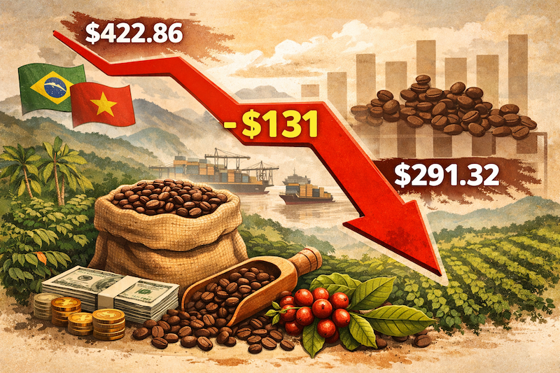 El precio internacional del café registró una caída de $131.54 por quintal entre el 11 de noviembre de 2025 y este 11 de febrero, al pasar de $422.86 a $291.32, en medio de condiciones climáticas favorables en los principales países productores.