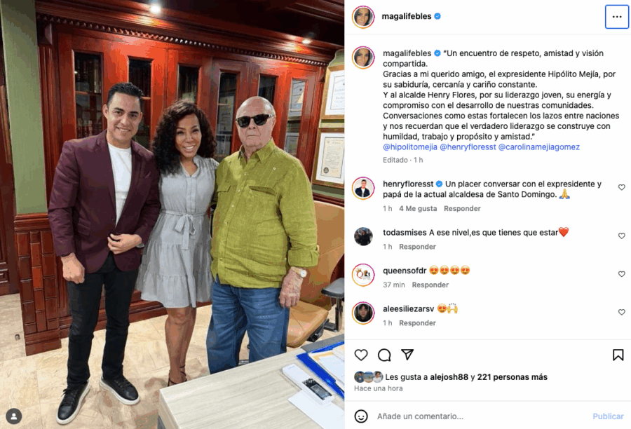 Pero tal parece que Flores sigue sosteniendo reuniones con visión cultural junto a Magali, quien este miércoles compartió una publicación en su Instagram, donde destacó un encuentro con el expresidente dominicano Hipólito Mejía, de 84 años y quien gobernó el país caribeño de 2000 a 2004.