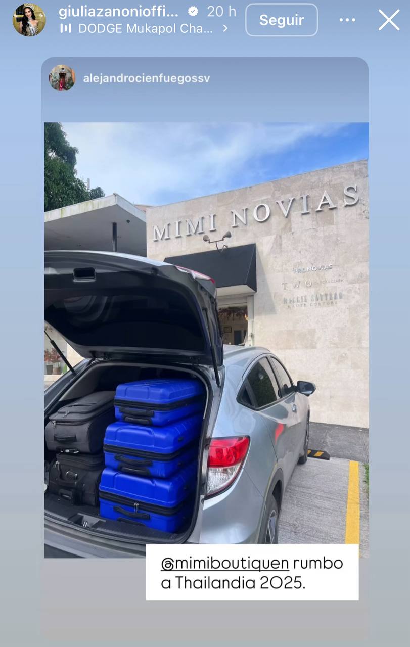 De hecho, Giulia recompartió este miércoles una publicación de su estilista Alejandro Cienfuegos, donde se muestra un buen cargamento de equipaje de vestuario rumbo a Tailandia, con prendas de diseñadores y casas de moda salvadoreñas, entre estos Mónica Arguedas, Jesús Alvarenga, Andrea Ayala y Mimi Boutique.