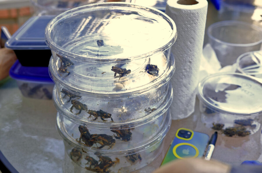 Recipientes con sapos conchos preparados para su liberación el 6 de noviembre de 2025 en la Finca el Tallonal en Arecibo (Puerto Rico). EFE/Thais Llorca