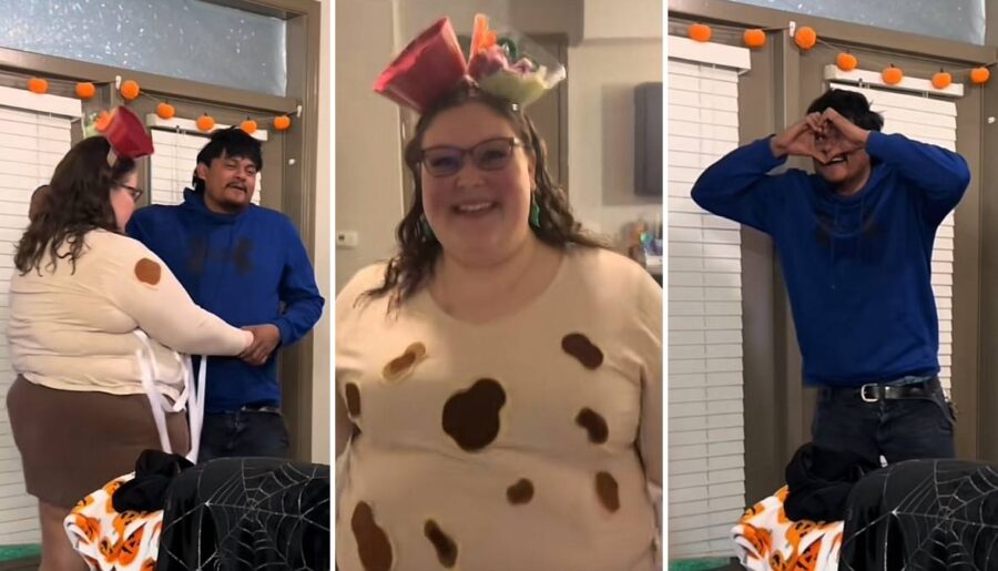 La dulce joven, cuyo nombre sería Bayleigh y al parecer es estadounidense, recreó el outfit de pupusa incluyendo los recipientes con curtido y salsa a la cabeza, y por si fuera poco utilizó pendientes de chile jalapeño para desperar el hambre de su pareja.