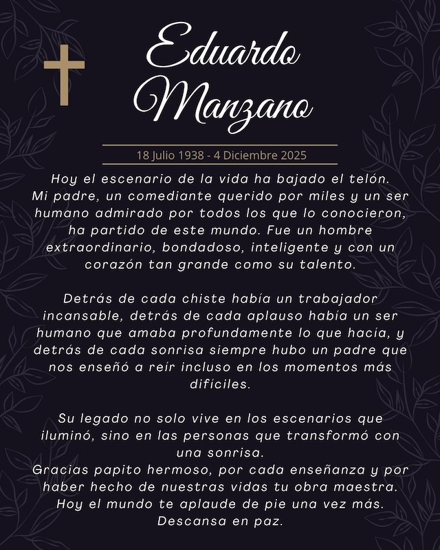 Eduardo Manzano, icónico actor y comediante mexicano, falleció el 4 de diciembre a los 87 años. Su muerte fue confirmada por su hijo, Lalo Manzano, a través de redes sociales, donde lo despidió con un emotivo mensaje: “Hoy el escenario de la vida ha bajado el telón”.