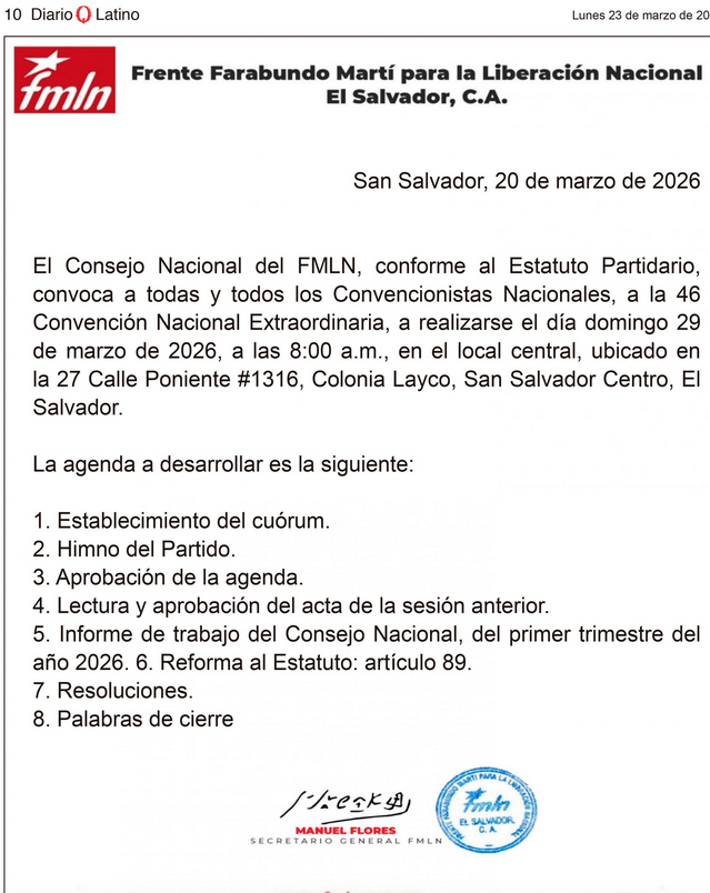El partido Frente Farabundo Martí para la Liberación Nacional (FMLN) tiene programado para el domingo 29 de marzo una Convención Nacional extraordinaria en la cual reformarían el artículo 89 de los estatutos, que exige a secretarios generales, adjuntos o directivos locales pedir permiso o renunciar si se postulan a un cargo de elección popular.