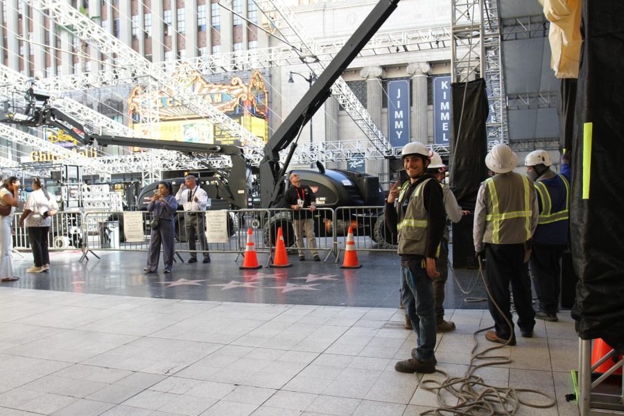 El desplazamiento de maquinaria pesada para levantar la carpa,  que acogerá la alfombra de unos 300 metros que recorre un tramo de la calle y termina en las escaleras del Teatro Dolby, se ha convertido en una atracción más para quienes se acercan a este lugar.