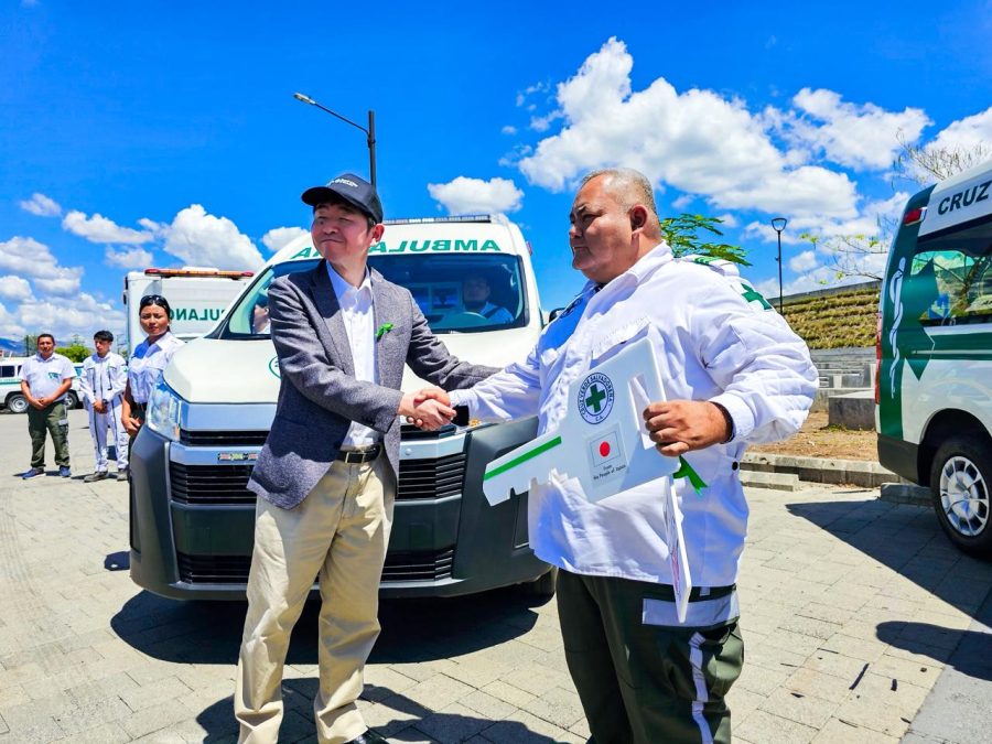La entrega fue hecha por el embajador de Japón en El Salvador Sano Taketoshi y recibida por el presidente de Cruz Verde, Luis Laínez.