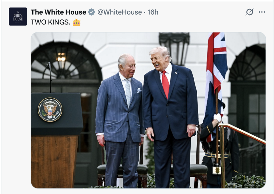 La Casa Blanca compartió este martes una fotografía del presidente de Estados Unidos, Donald Trump, junto al monarca británico, Carlos III, durante su visita de Estado a Washington, acompañada de la leyenda «dos reyes», lo que generó críticas en redes sociales.