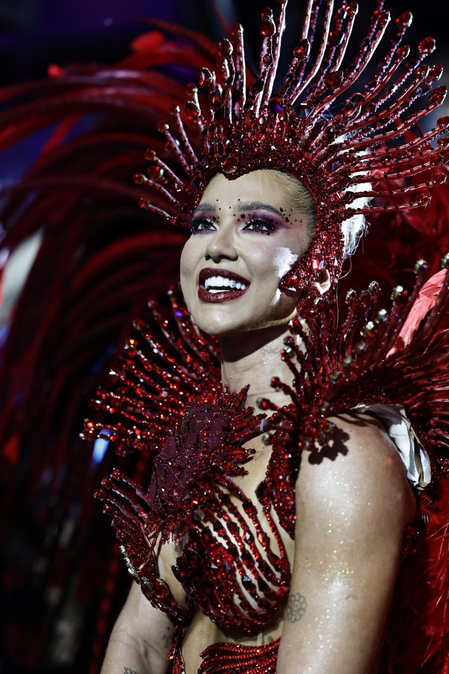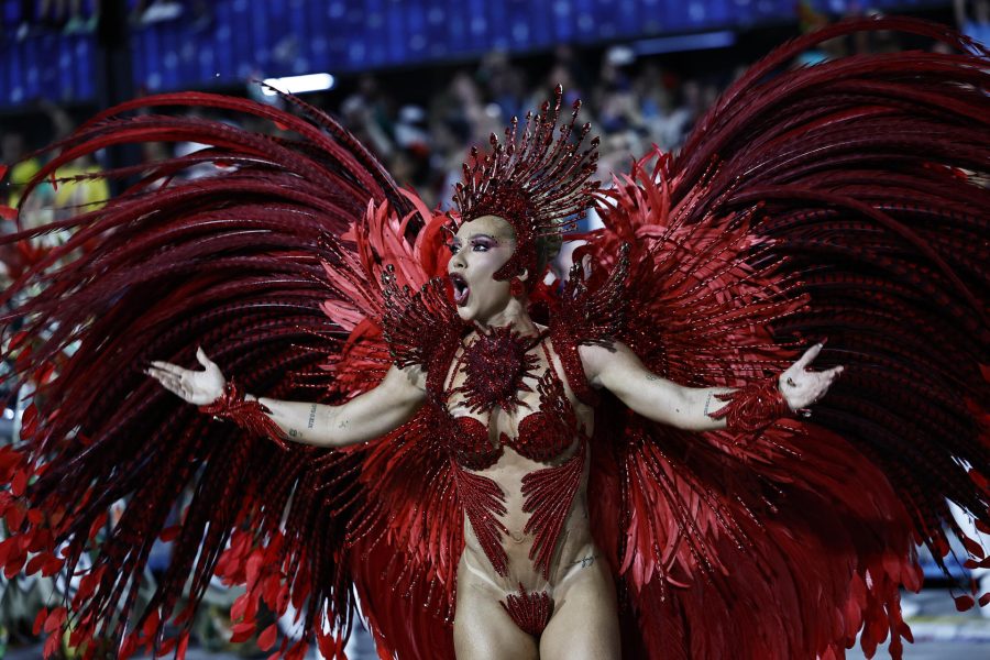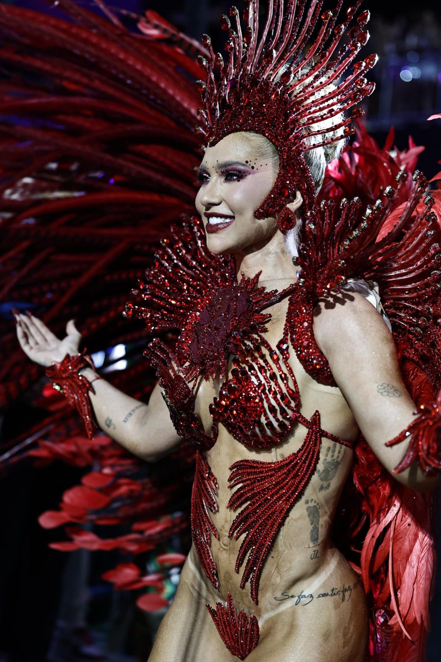 Vestida con un lujoso traje rojo brillante, pero con muchas transparencias, con pedrería y plumas que evocaban el tema que inspiró el desfile de la escuela, Fonseca cruzó los 700 metros del sambódromo al frente de los cerca de 300 percusionistas de la «Invocada», como se conoce a la ‘batería’ (orquesta) de Grande Río.