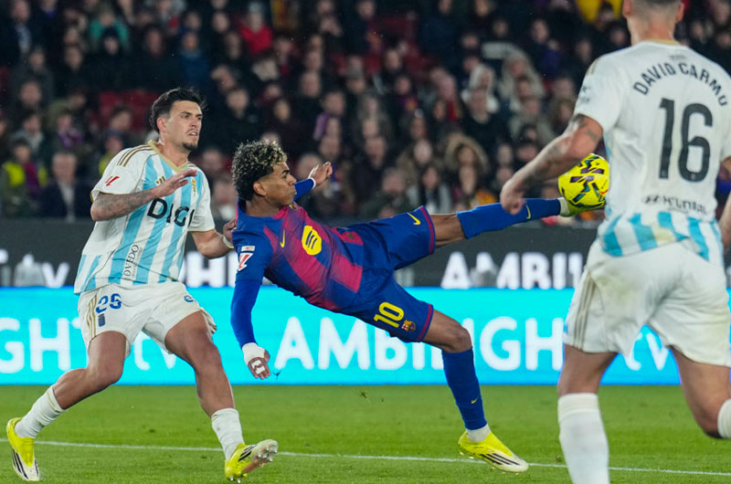 Abrió el marcador Dani Olmo -sexto gol en los últimos nueve partidos-, tras presión y pase de Lamine Yamal, y lo cerró la estrella azulgrana, con una media chilena que levantó a la grada, tras una asistencia de Olmo. Entremedias, se sumó a la fiesta Raphinha, que aprovechó un nuevo error defensivo de los ovetenses. «Lamine Yamal es un jugador de otra galaxia», sentenció Almada, el técnico rival, tras el partido.