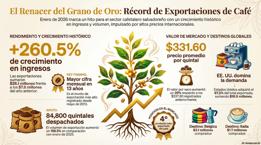 Las exportaciones de café salvadoreño registraron un crecimiento interanual de 260.5 % en enero, al sumar $28.1 millones, la mayor cifra mensual en los últimos 13 años, según el Banco Central de Reserva (BCR).