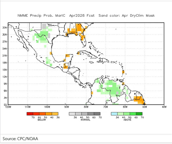 El organismo señala que, aunque las precipitaciones serán normales en la mayor parte de la región, algunas zonas específicas, como el norte de Guatemala, registrarían niveles por debajo de lo habitual. Esta variabilidad en las lluvias podría obligar a los agricultores a postergar la siembra hasta contar con condiciones adecuadas de humedad en los suelos.
