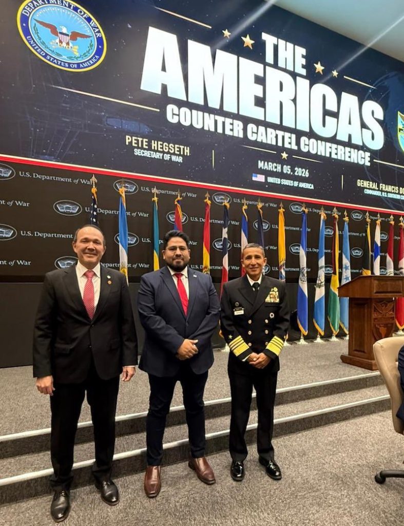 El ministro de Justicia y Seguridad Pública, Gustavo Villatoro, y el ministro de la Defensa Nacional, René Francis Merino Monroy, participan en la conferencia regional “América Contra los Cárteles”, que se desarrolla en la sede del Comando Sur de Estados Unidos, en Florida, Miami, Estados Unidos, informó el Ministerio de Seguridad a través de X.