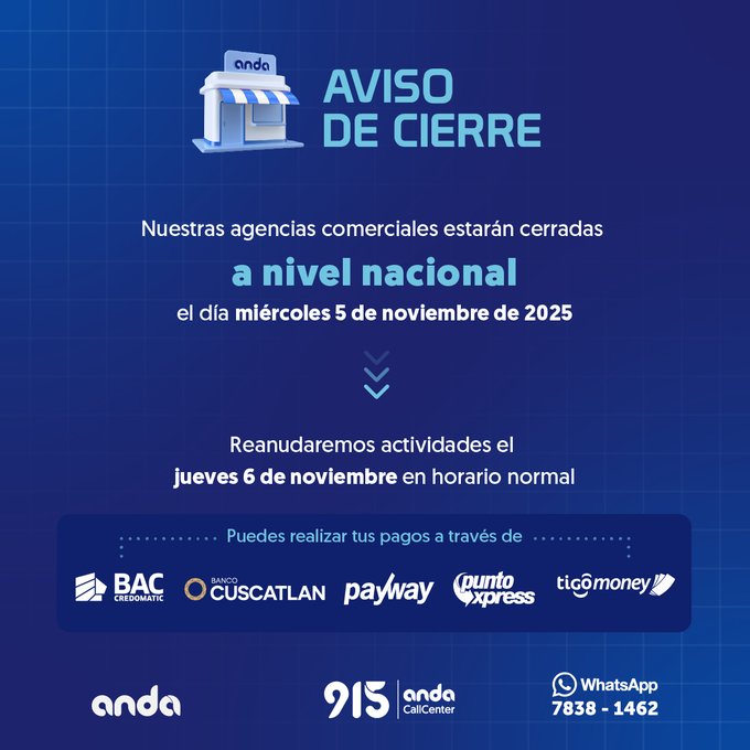 La Administración Nacional de Acueductos y Alcantarillados (ANDA) informó este martes que todas sus agencias comerciales estarán cerradas el miércoles 5 de noviembre.