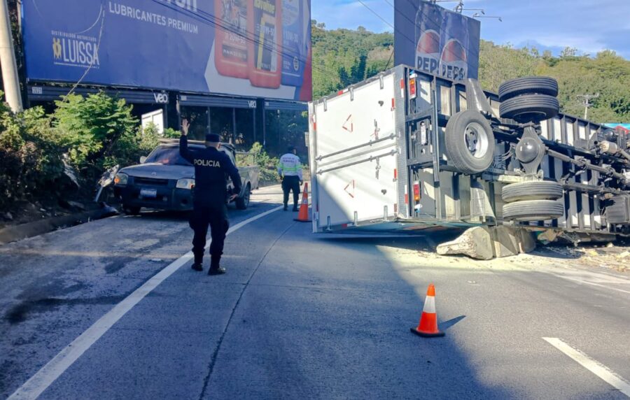 Un camión de carga volcó este martes en la Curva El Papaturro, sobre el kilómetro 30 de la carretera que conduce al Puerto de La Libertad, generando un cierre total de la vía durante varias horas. La Policía Nacional Civil (PNC) atribuyó el accidente a una distracción del conductor.