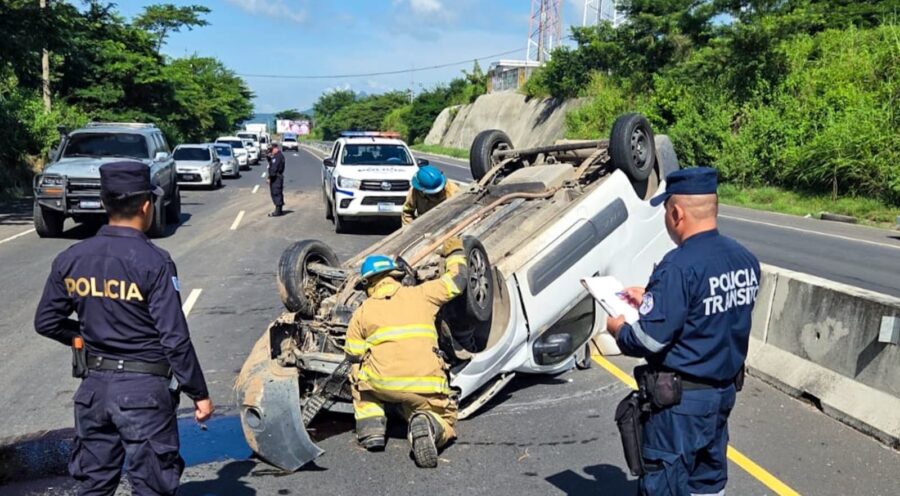 La Policía Nacional Civil (PNC) reportó a dos personas lesionadas luego de un accidente de tránsito ocurrido en el kilómetro 56 de la carretera Litoral, en el cantón Concepción Jalponga del distrito Santiago Nonualco, La Paz Centro.