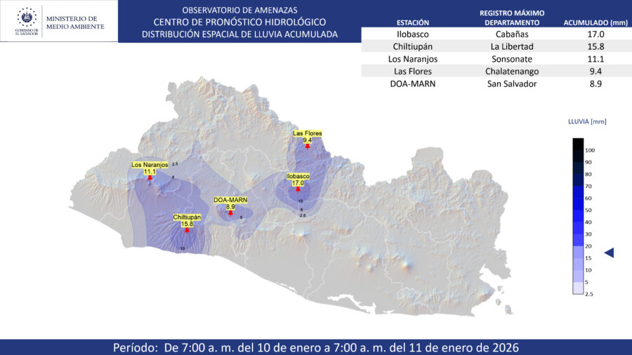 El Ministerio de Medio Ambiente y Recursos Naturales (Marn) reveló que entre las 7:00 de la mañana del sábado y las 7:00 de la mañana de este domingo cayeron 17 milímetros de lluvia en Ilobasco, Cabañas, el lugar que más agua recibió.