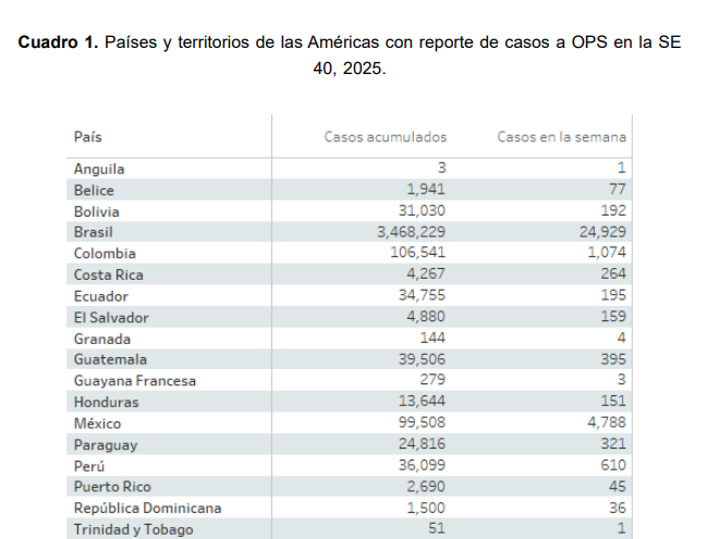 El boletín reveló que hasta la semana 40 se reportaron más de 3.97 millones de casos sospechosos de la enfermedad en toda la región de América, con una incidencia acumulada de 391 casos por cada 100,000 habitantes.