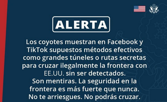 «ALERTA: Están circulando videos en Facebook y TikTok donde traficantes promocionan supuestos métodos efectivos para cruzar la frontera sin ser detectados, como túneles elaborados o rutas por donde aseguran que se puede pasar sin ser visto», advirtió la oficina diplomática.