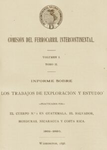 Portadilla del informe de la Comisión del Ferrocarril Intercontinental emitido tras su exploraciones en la región centroamericana entre 1891 y 1893. Colección privada del Ing. Carlos Quintanilla, San Salvador.