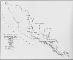 Mapa de octubre de 1933 que presenta el trazado mexico-centroamericano de la Carretera Inter-Americana, Departamento de Estado, WDC, 1933.