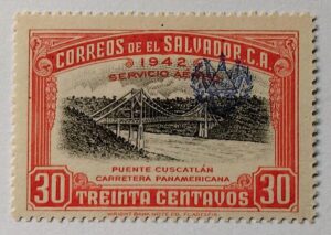Sello postal para correo aéreo, emitido en 1942 con motivo de la inauguración del puente Cuscatlán sobre el río Lempa y la Carretera Panamericana.