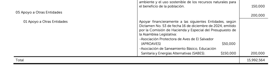 El documento de presupuesto aprobado para 2025 no da mayores detalles, pero señala que de los $200,000 para apoyar a otras entidades, el monto señalado es para APROAVES y el resto, $150,000 para Asociación de Saneamiento Básico, Educación Sanitaria y Energías Alternativas (SABES).
