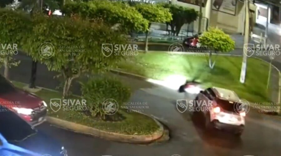 Las cámaras del sistema de videovigilancia de la alcaldía de San Salvador Centro, llamado “Sivar Seguro”, captaron el momento en el que el vehículo tipo sedán realizó una vuelta de “U” antes de llegar a la intersección, sin embargo, al momento de incorporarse a la otra vía, este vehículo impacta contra el motociclista quien cayó inmediatamente desde su vehículo al asfalto. Este accidente ocurrió a las 7:25 de la noche del domingo.