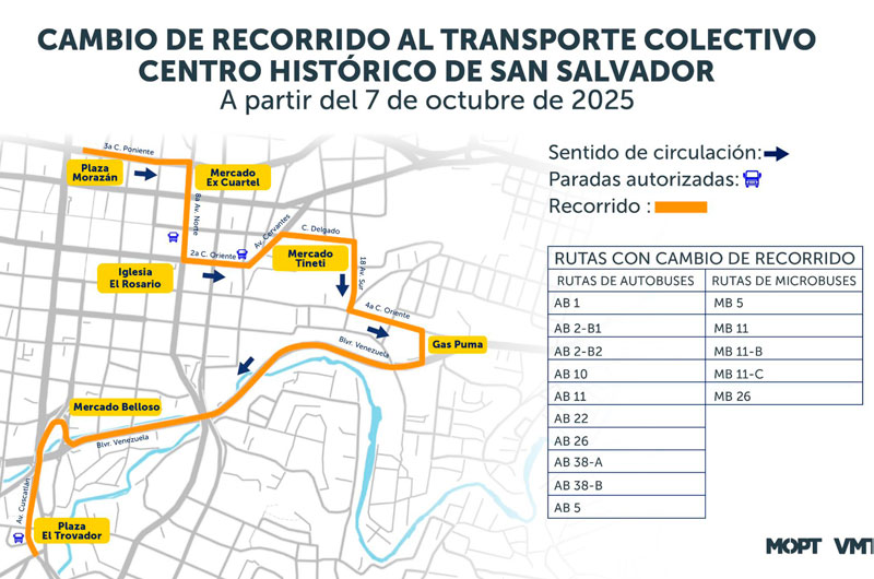 A partir del martes 7 de octubre, se implementarán cambios en los recorridos de autobuses y microbuses en sus trayectos norte-sur en el Centro Histórico de San Salvador.