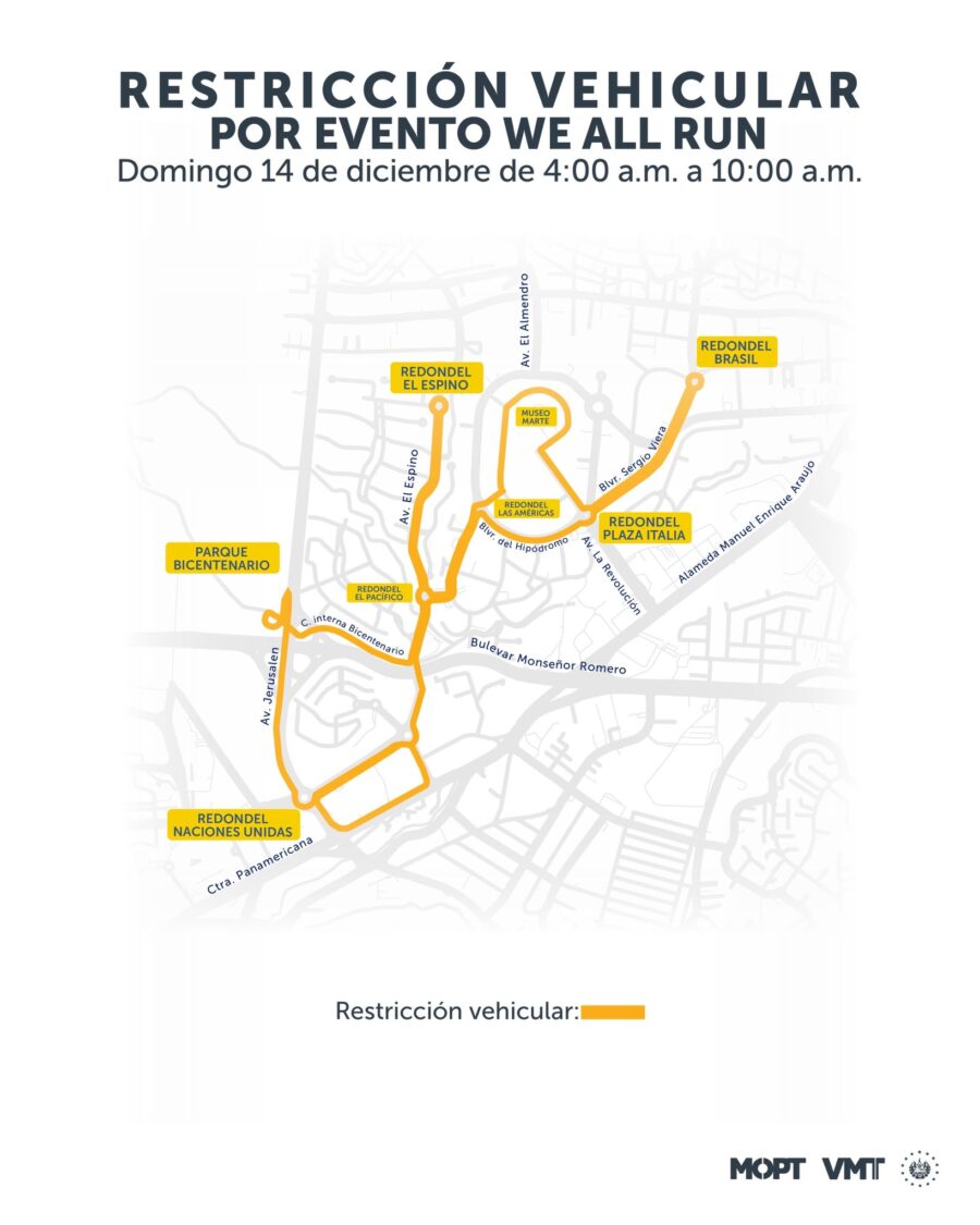 El Viceministerio de Transporte (VMT) informó que en nueve calles cercanas a los centros comerciales Multiplaza y la Gran Vía, en Antiguo Cuscatlán, y en la colonia San Benito habrá restricción este domingo debido a la carrera «We all run».