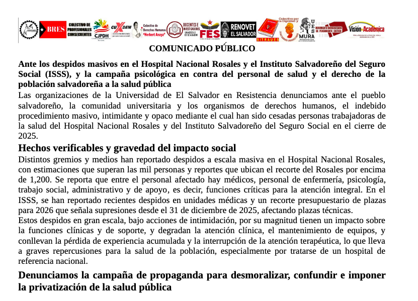 Organizaciones universitarias de derechos humanos se pronunciaron sobre los despidos masivos de personal de salud en el Hospital Nacional Rosales y en el Instituto Salvadoreño del Seguro Social (ISSS), ocurridos en los últimos días y exigieron el reinstalo inmediato de las personas cesadas, al advertir graves afectaciones a la atención médica de la población salvadoreña.