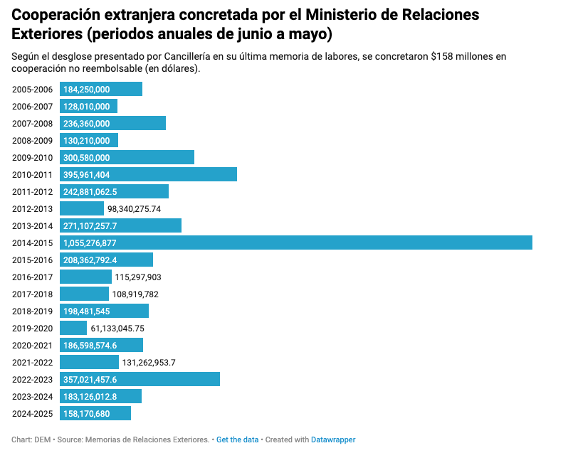 En el más reciente periodo, de junio de 2024 a mayo de 2025, los marcos de cooperación internacional concretada no reembolsable mencionados en la memoria de labores sumaron $158.1 millones.