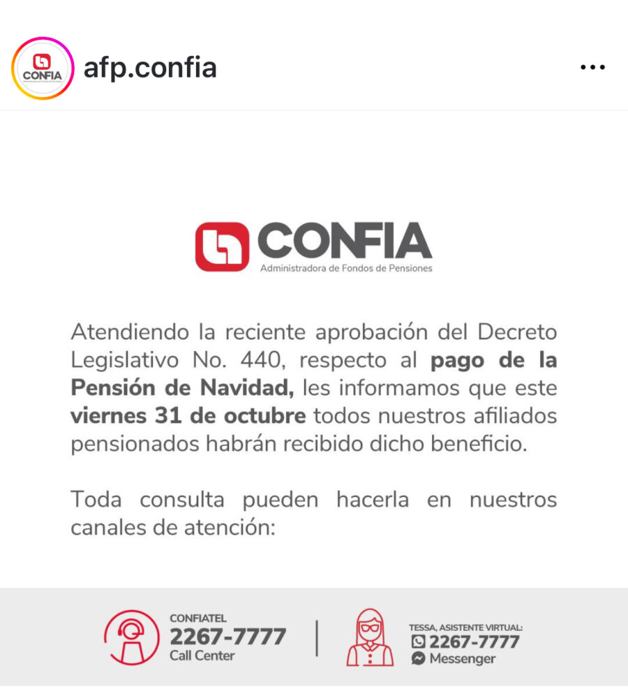 «Atendiendo a la reciente aprobación del decreto legislativo No. 440, respecto al pago de la Pensión de Navidad, les informamos que este viernes 31 de octubre todos nuestros afiliados pensionados habrán recibido dicho beneficio», dice el mensaje de CONFÍA. Los usuarios pueden consultar al  teléfono o WhatsApp 2267-7777.